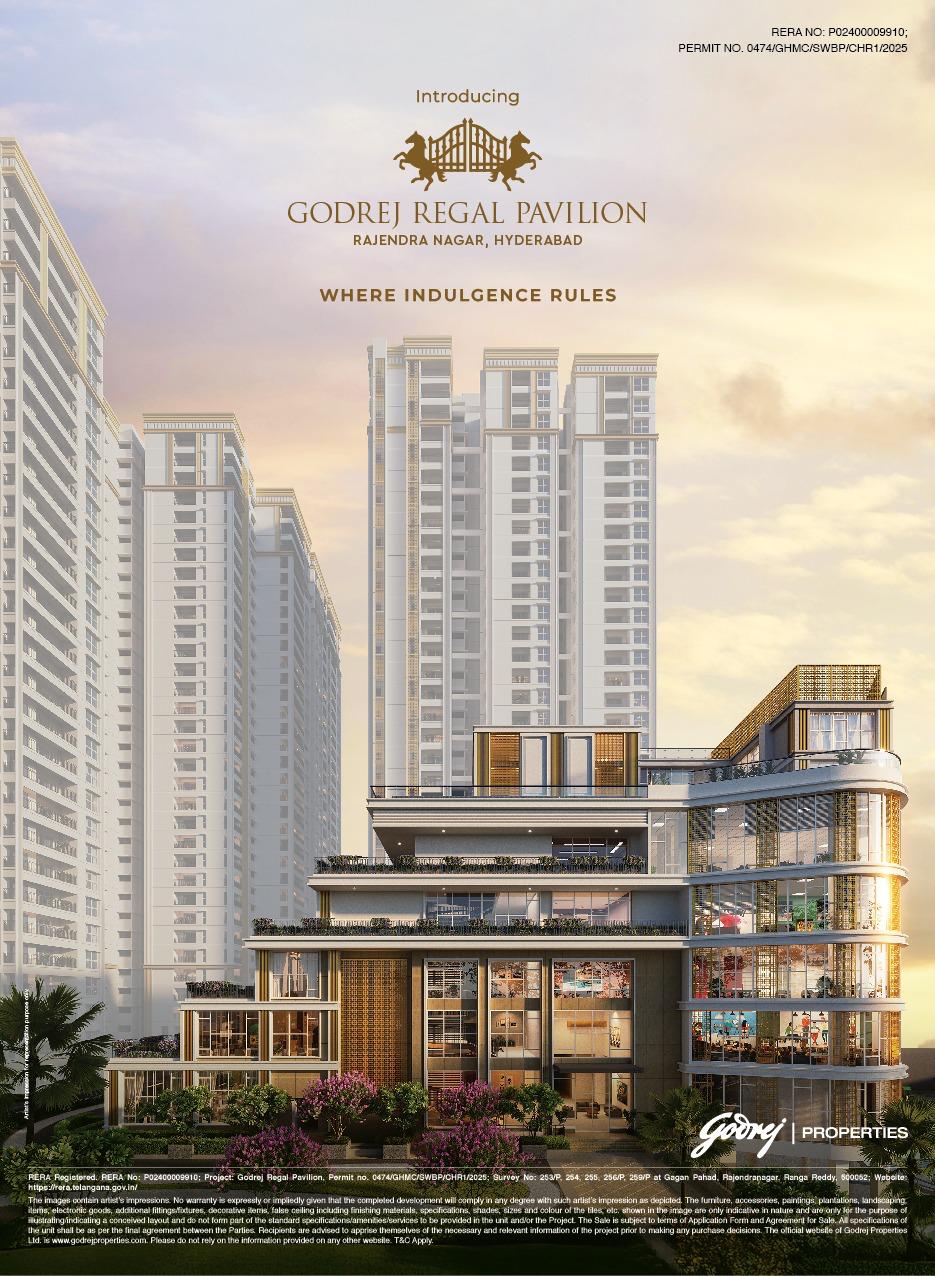 Godrej Regal Pavilion will be constructed on 12.6 acres of land parcel, 9 towers with Ground+32 floors having 2 BHK, 3 BHK & 4 BHK premium residences. Regal Pavilion Godrej Project is located Near Srinagar - Kanyakumari Highway, Rajender Nagar, Hyderabad with - Nehru Outer Ring Road - 4km, Escape Water Park - 7km, MPS Cricket Ground - 7.8km. Godrej Properties Shamshabad Project first is internal amenities - Vitrified tiles, Granite Kitchen, SS Si...k, CCTV & many more. Godrej Hyderabad Shamshabad External Amenities Project has 50+ luxurious amenities with likes of -Gymnasium, Swimming Pool, Indoor Games, Yoga Room, Kid's Play Area & Many More. Godrej Regal Pavilion Hyderabad Project has One type of car parking facility - Ground. Godrej Regal Pavilion Rajendra Nagar Possession - Rera Possession - December 2029 and Target Possession - December 2028. Carpet Area & Floor Plan of Godrej Regal Pavilion Brochure project has 2BHK, 3BHK & 4BHK premium residences with - 2BHK - (1352 - 1429) sqft, 3BHK - (1680 - 2674) sqft and 4BHK- (2883- 3572) sqft. Godrej Regal Pavilion floor plans will have 6 flats 2 lift & 1 staircases on each floor. Godrej Shamshabad Hyderabad prices & its details can be found in the price section & Godrej Regal Pavilion Shamshabad brochure can be downloaded from the link mentioned below. Project has been praised by the home buyers & Godrej Properties Hyderabad review is 4 out of 5 from over all the clients who have visited the site.